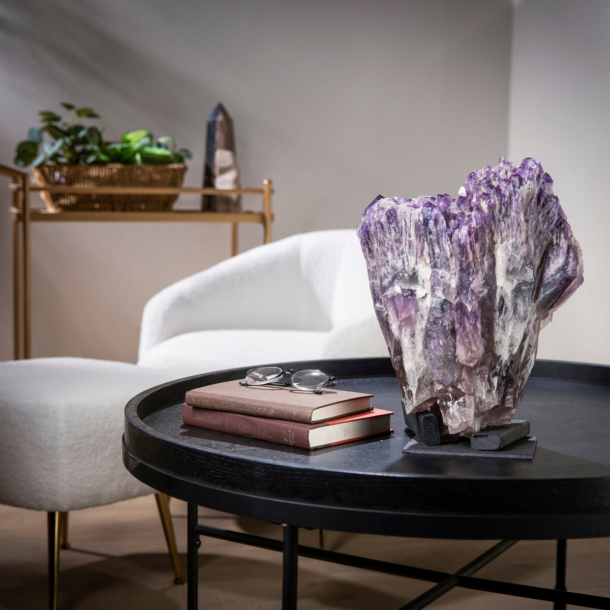 This magnificent Elestial Amethyst Cluster Point features a natural skeletal, step-like formation with multiple layered terminations that reach elegantly skyward. Its rich violet hues melt into soft lavender tips, creating a luminous, ethereal presence that captivates the eye. The intricate structure embodies ascension, transformation, and spiritual evolution, making it a statement piece for any refined space.